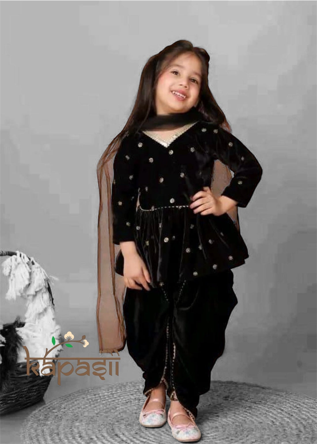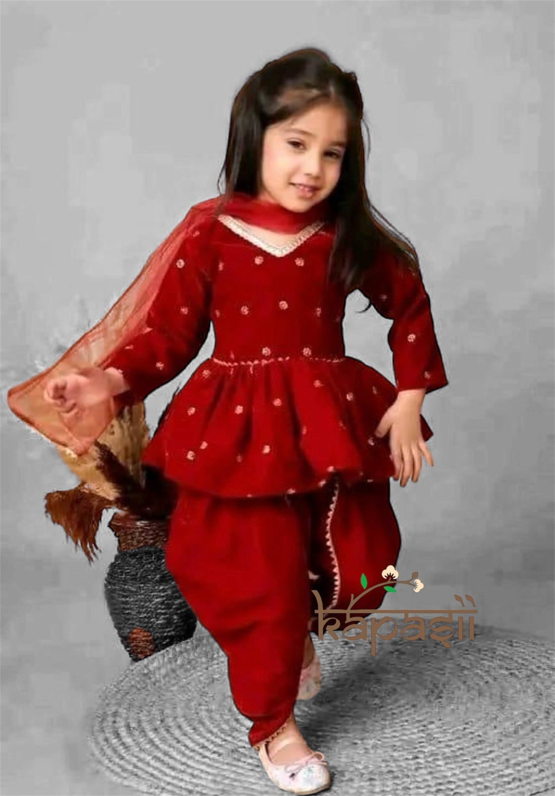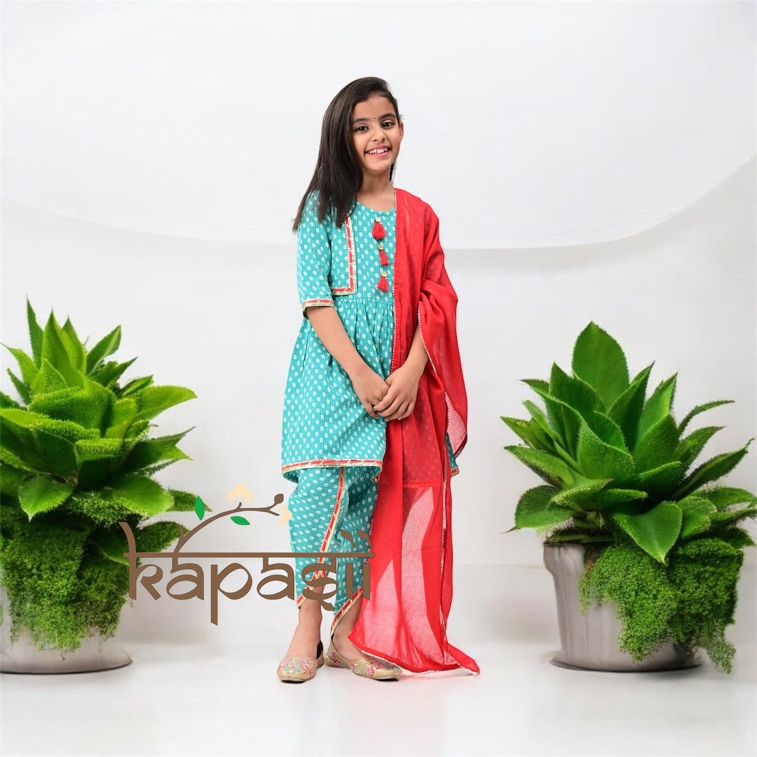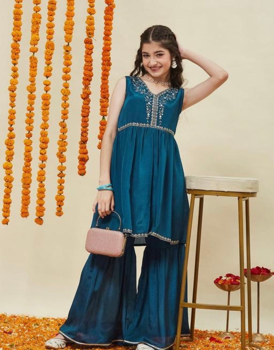 Girls festive sleeveless poly chinon top with Sharara set teal