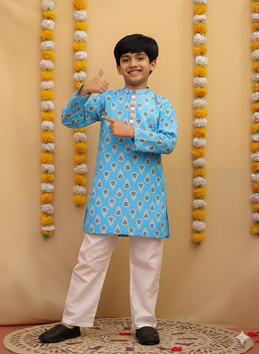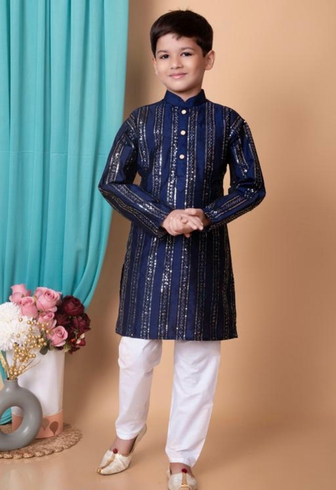 Navy blue heavy embroidery and mirror work festive boys kurta pajama set
