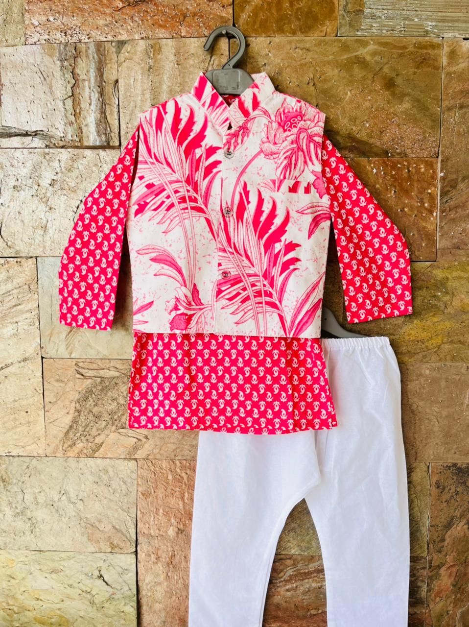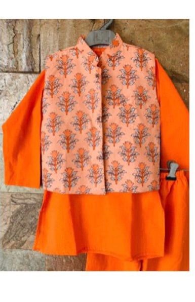 Solid colour kurta and pajama set with printed jacket and elastic pajama Collar: slit collar at...