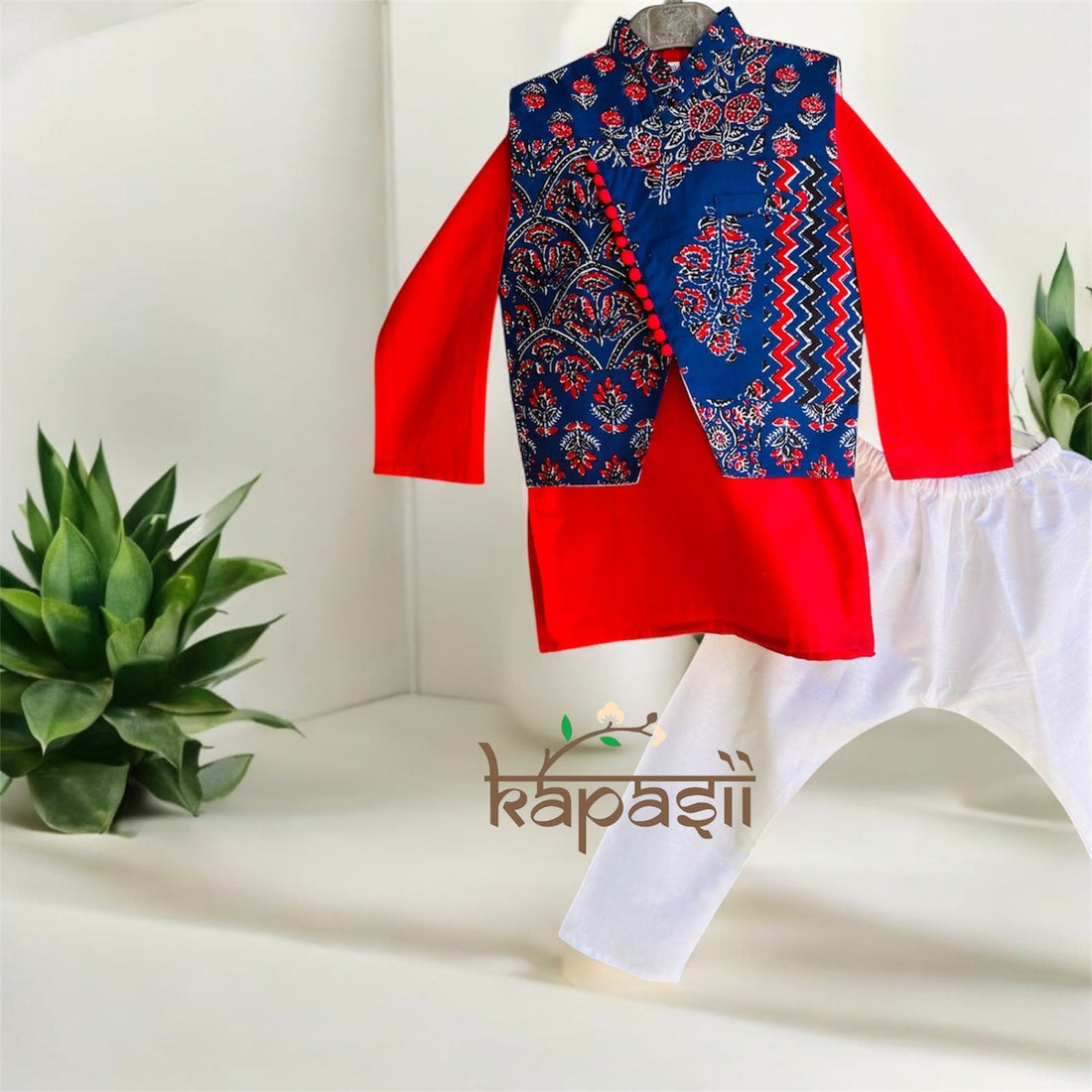 Red kurta paired with printed jacket set jacket with trending curve cut jacket has metal...