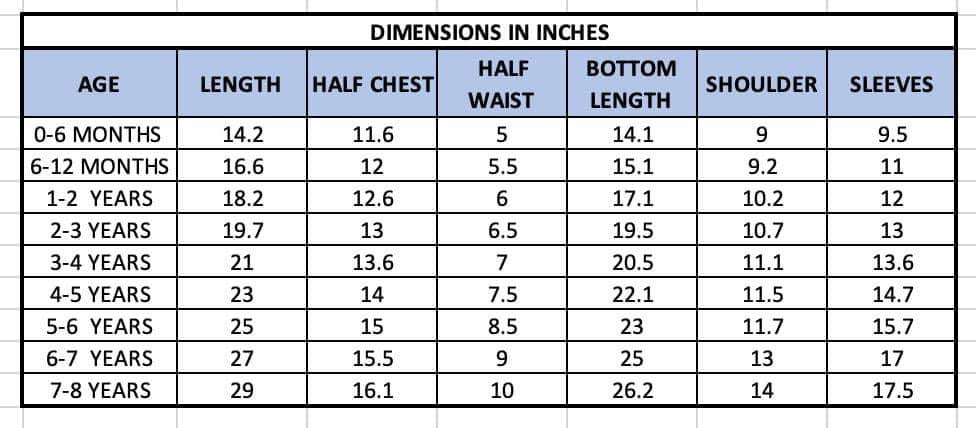 Our collections are designed to grow with your little ones. We offer a full range of sizes, starting from newborn (0–6 months) all the way up to 14 years. Each piece is crafted for comfort, durability, and style at every stage of childhood. For detailed measurements, please refer to our Size Guide to help you find the perfect fit.