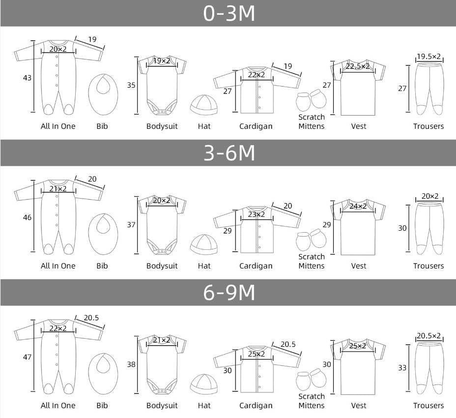 -The 5 pc set consists of perfectly sized Sleepsuit romper with foot cover, onsie, pair of mittens, cap, and a square bib with a popper.