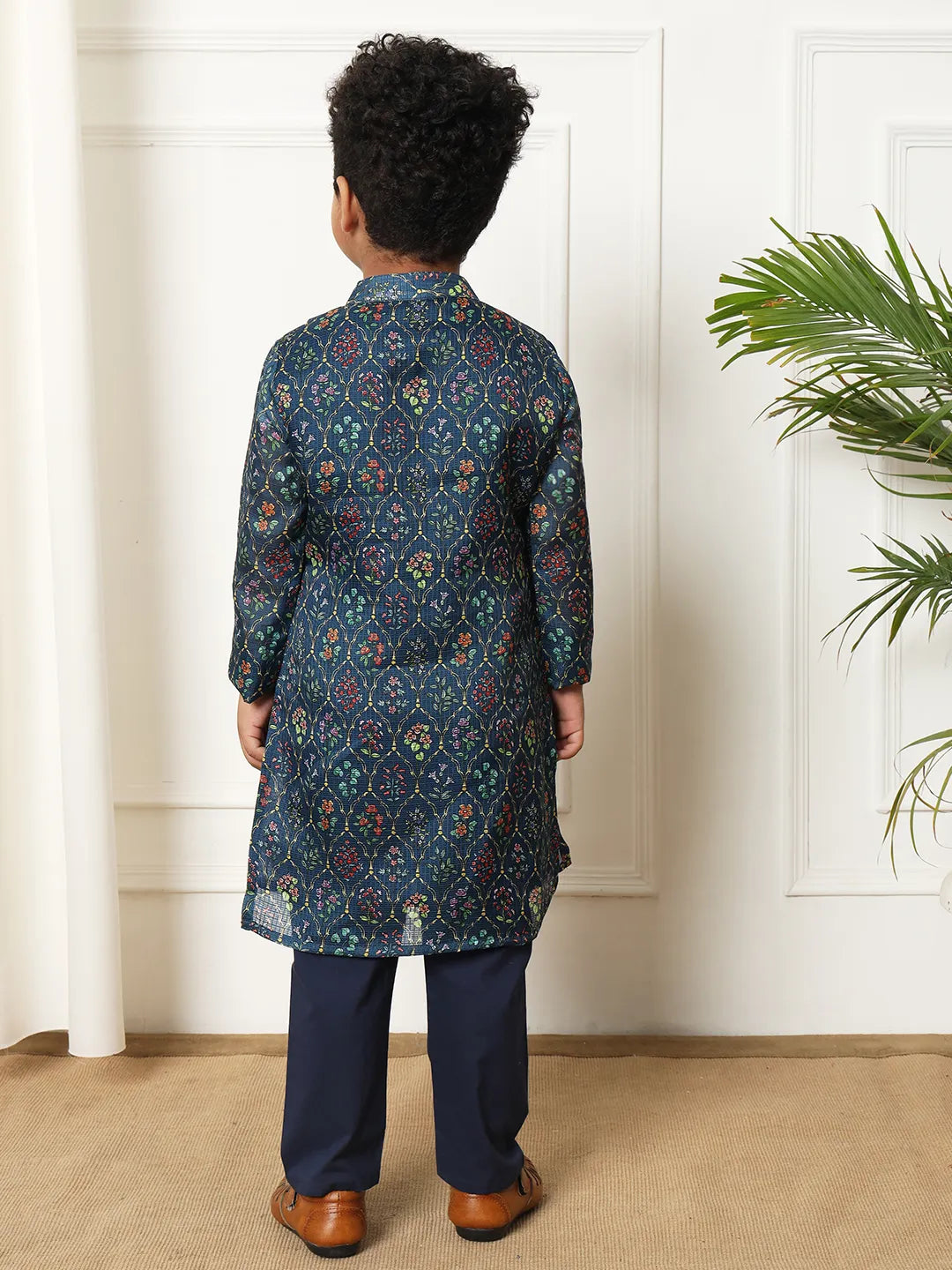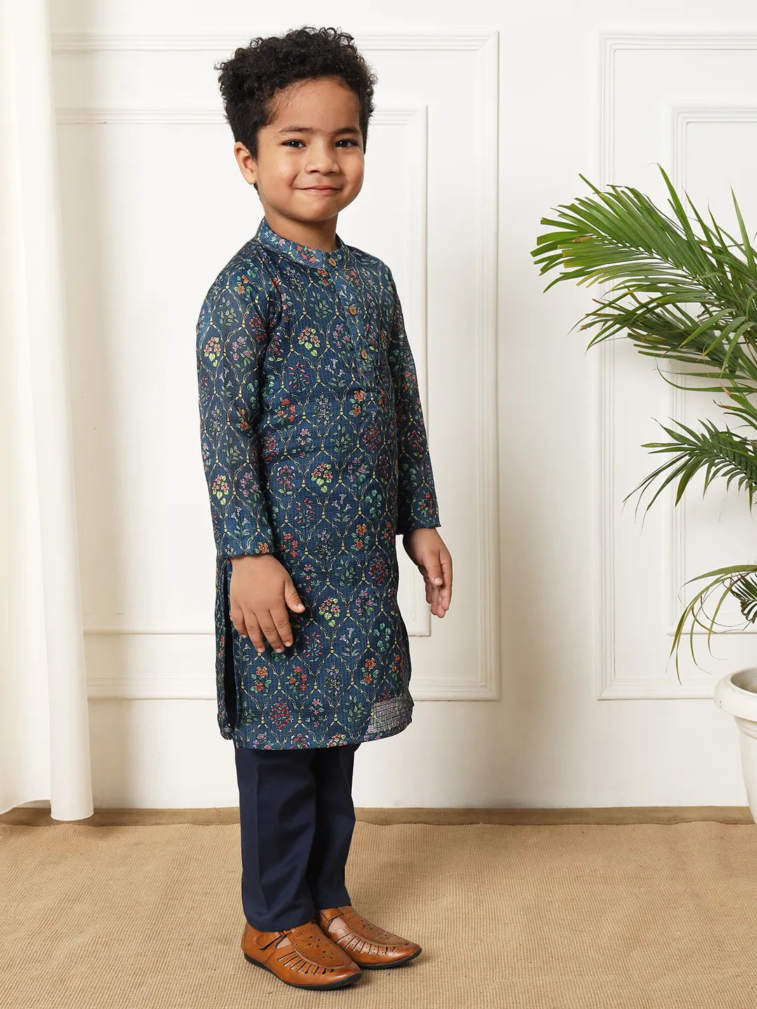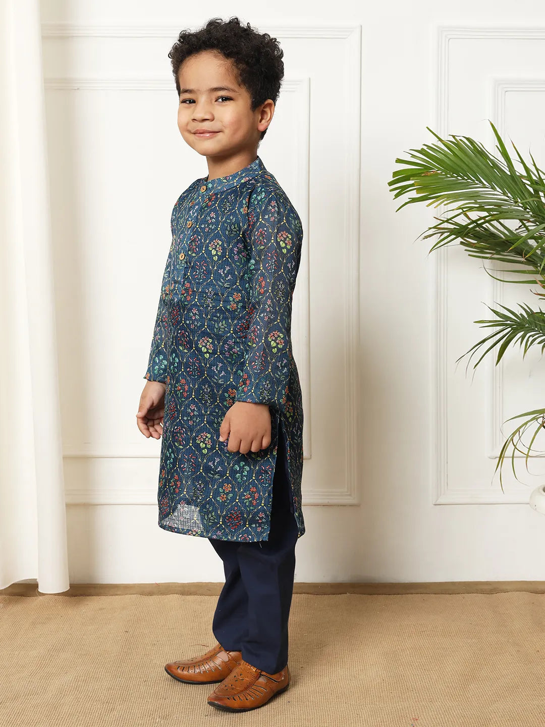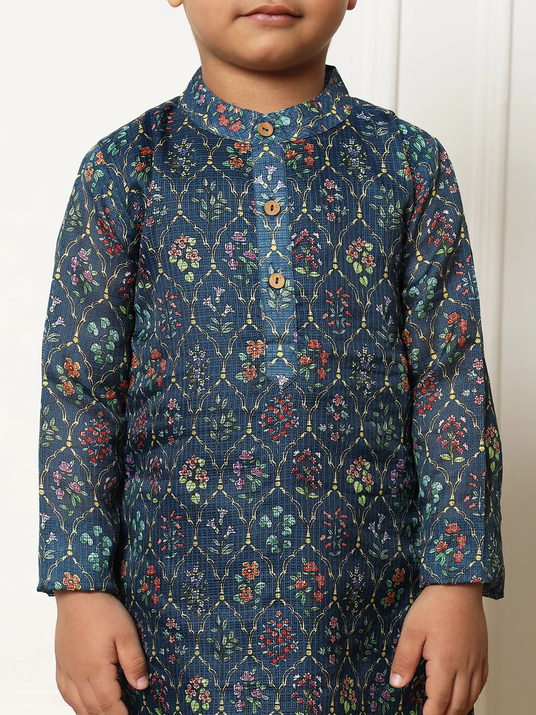 Boys Straight style kota Doria fabric Navy Blue color Floral printed kurta with Pyjama