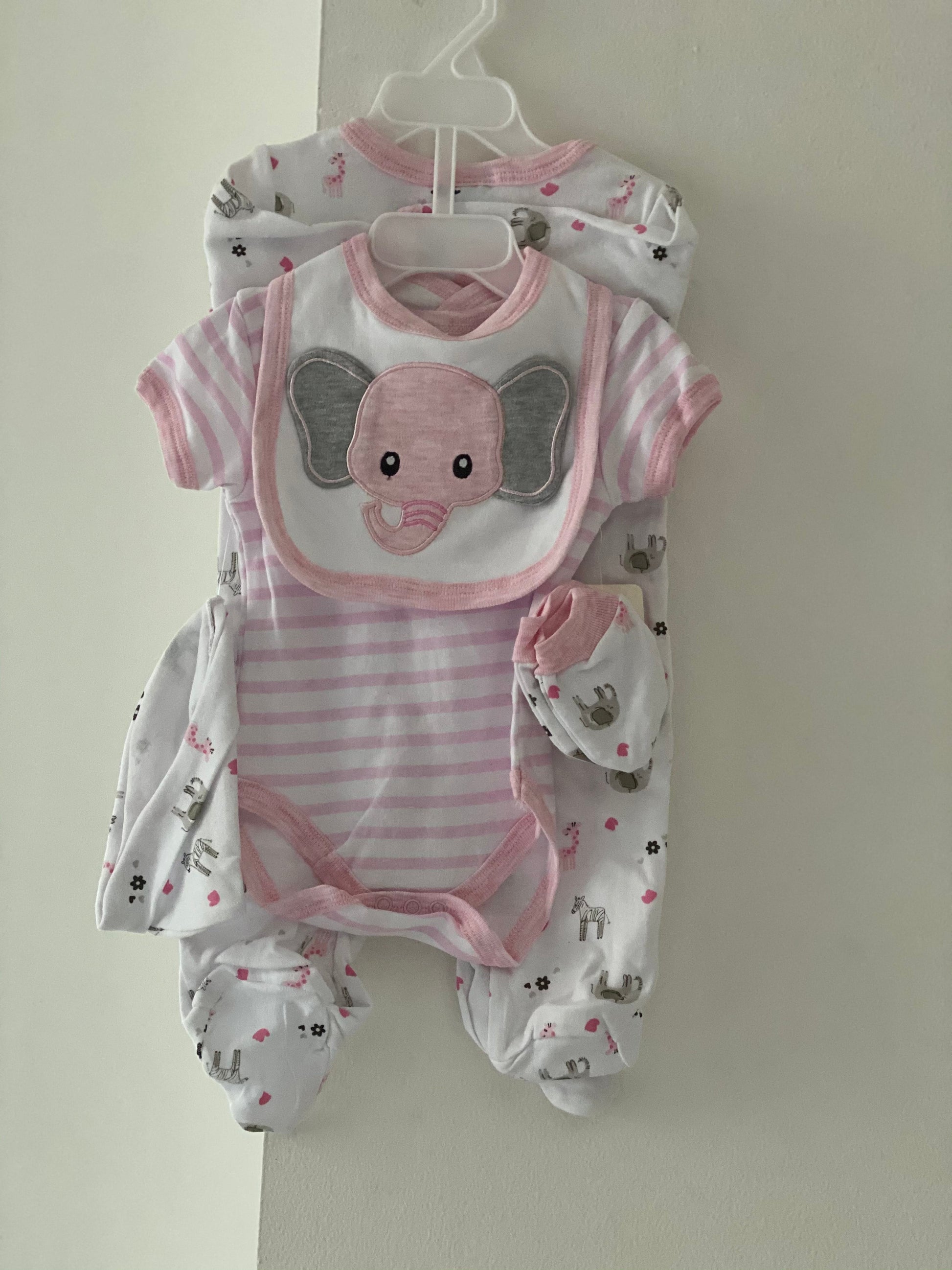 -The 5 pc set consists of perfectly sized Sleepsuit romper with foot cover, onsie, pair of mittens, cap, and a square bib with a popper.