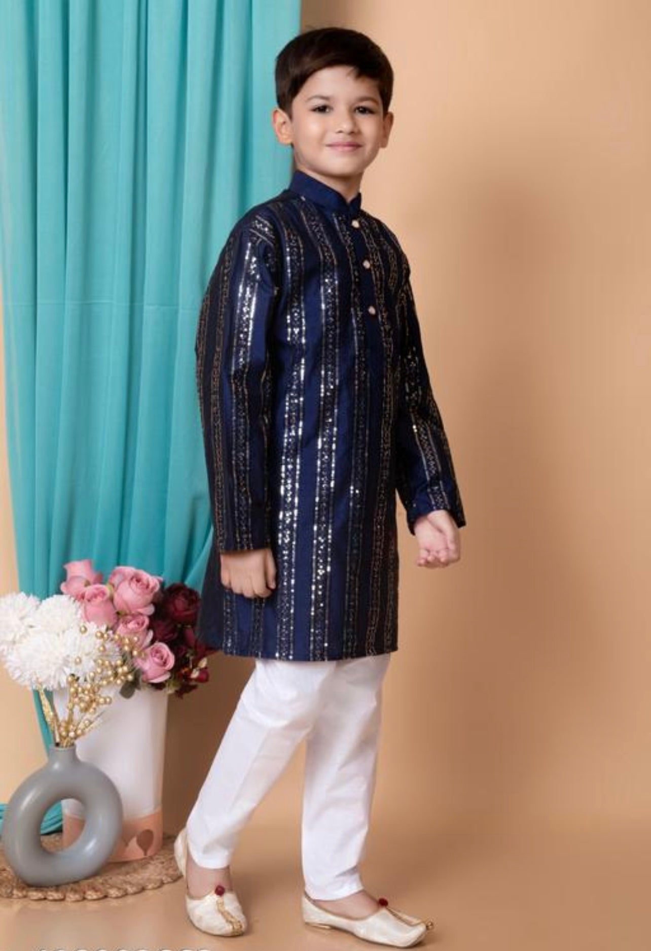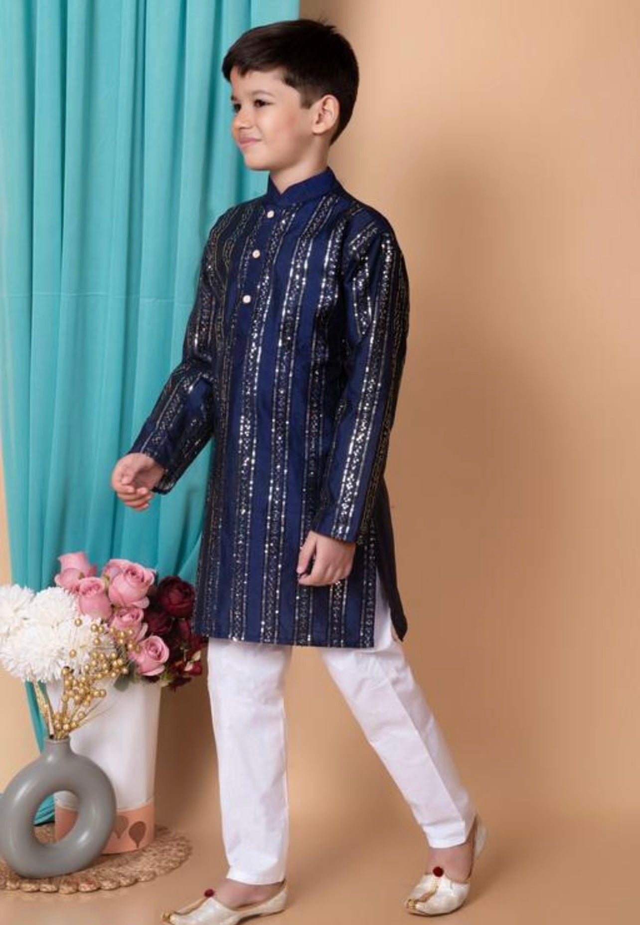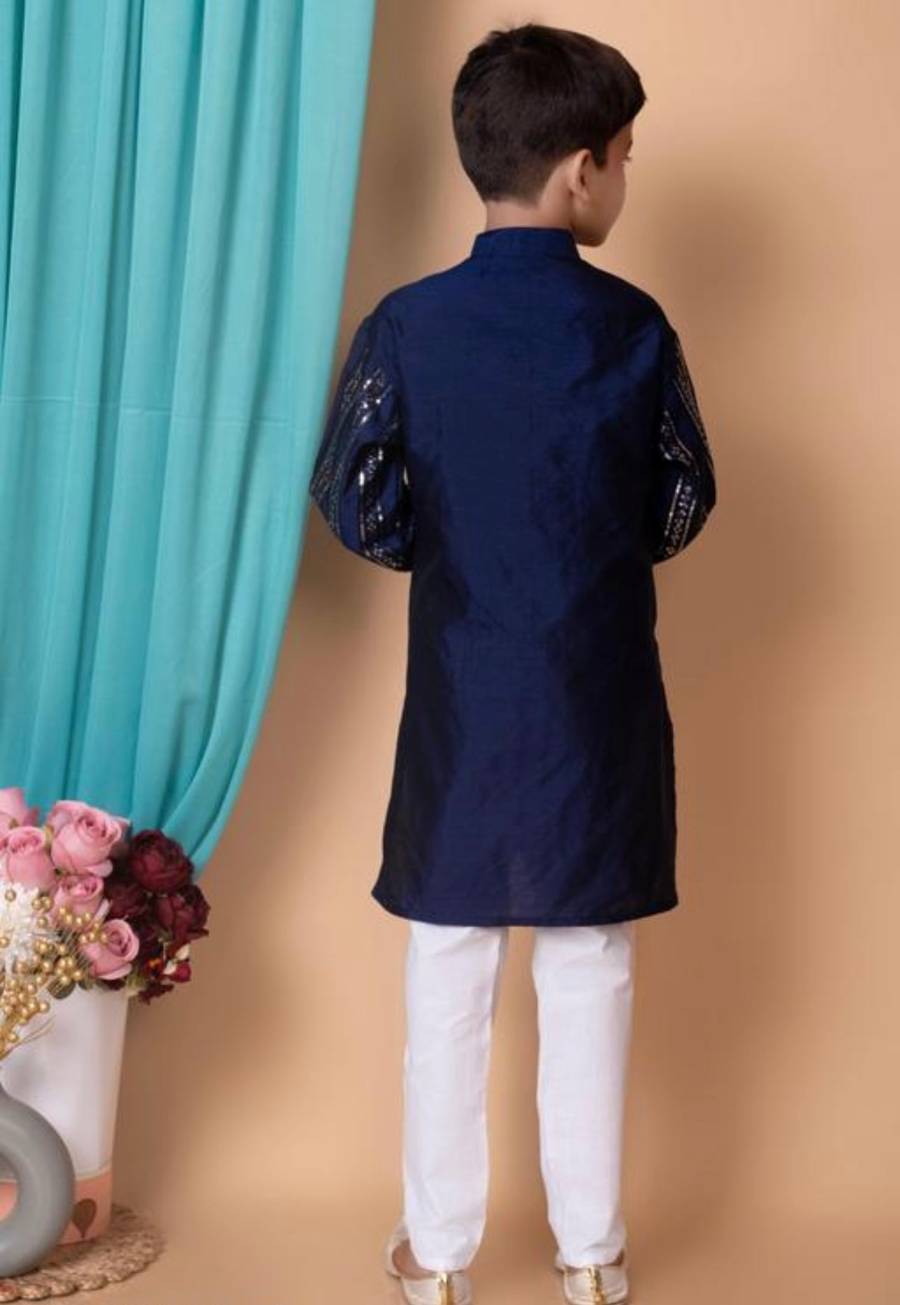 Navy blue heavy embroidery and mirror work festive boys kurta pajama set