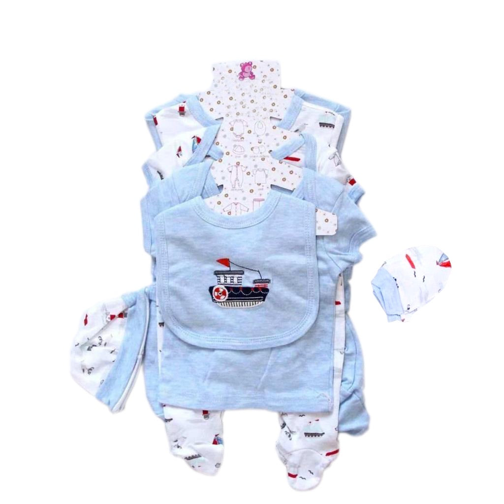 -The 8pc set consists of perfectly sized Sleepsuit romper with foot cover, onsie, pair of mittens, cap, shirt with buttons, T-shirt, pants with footsies and a square bib with a popper.